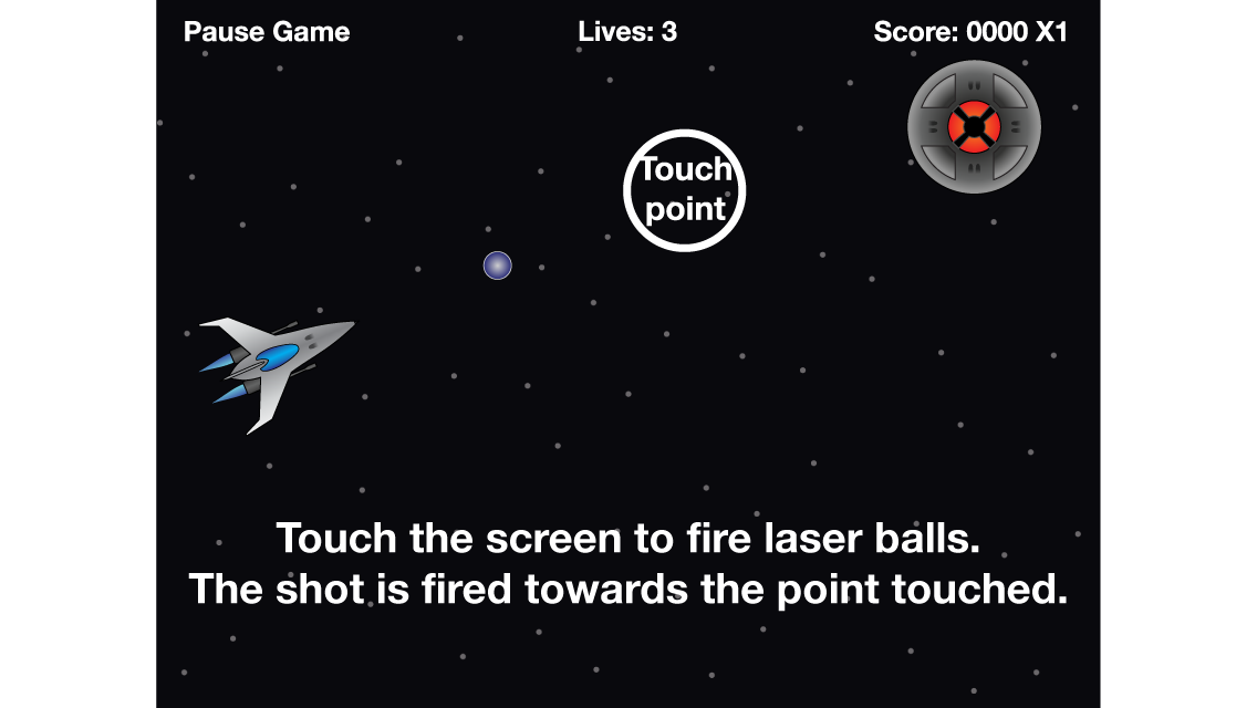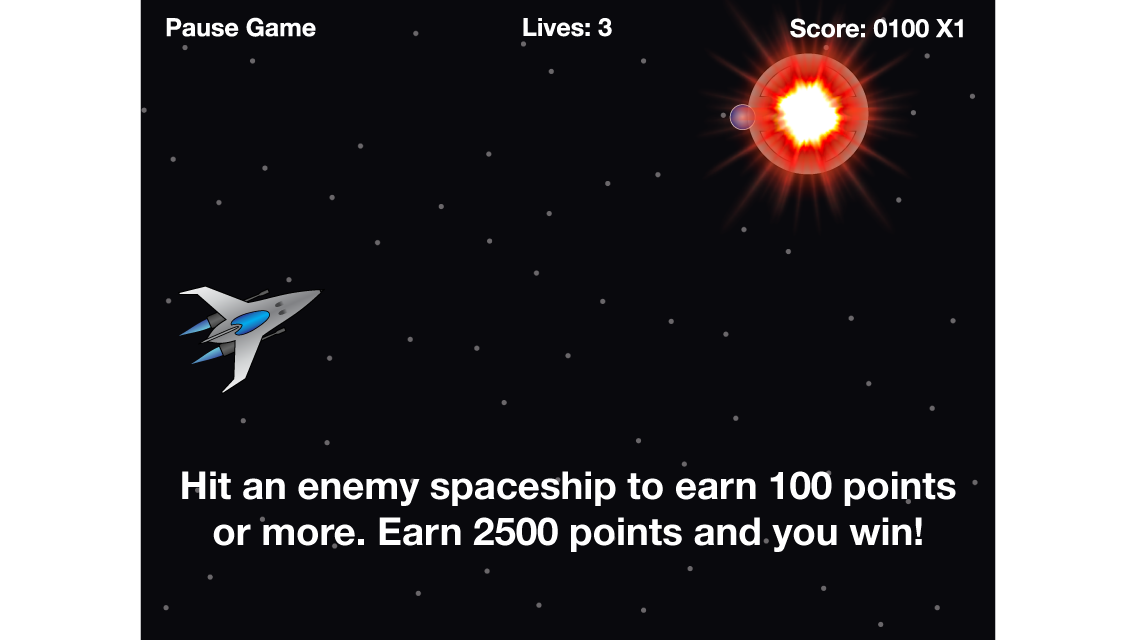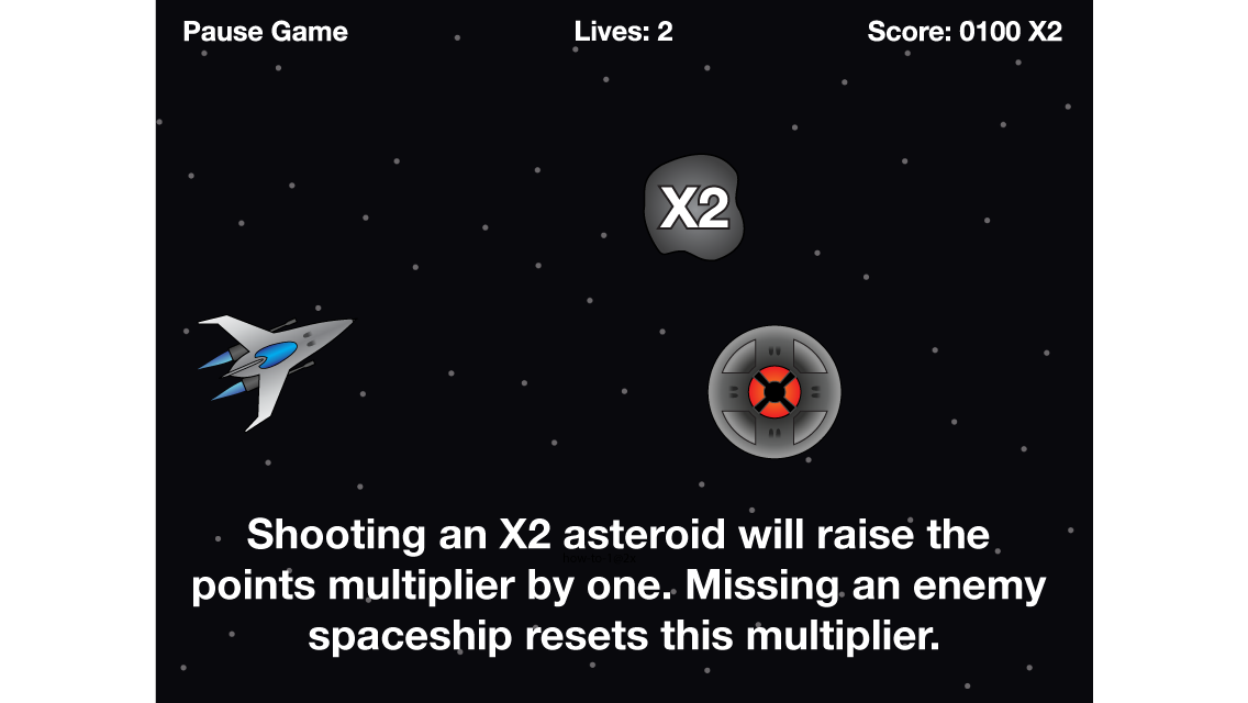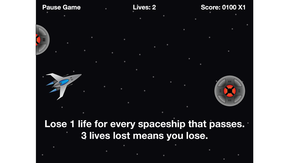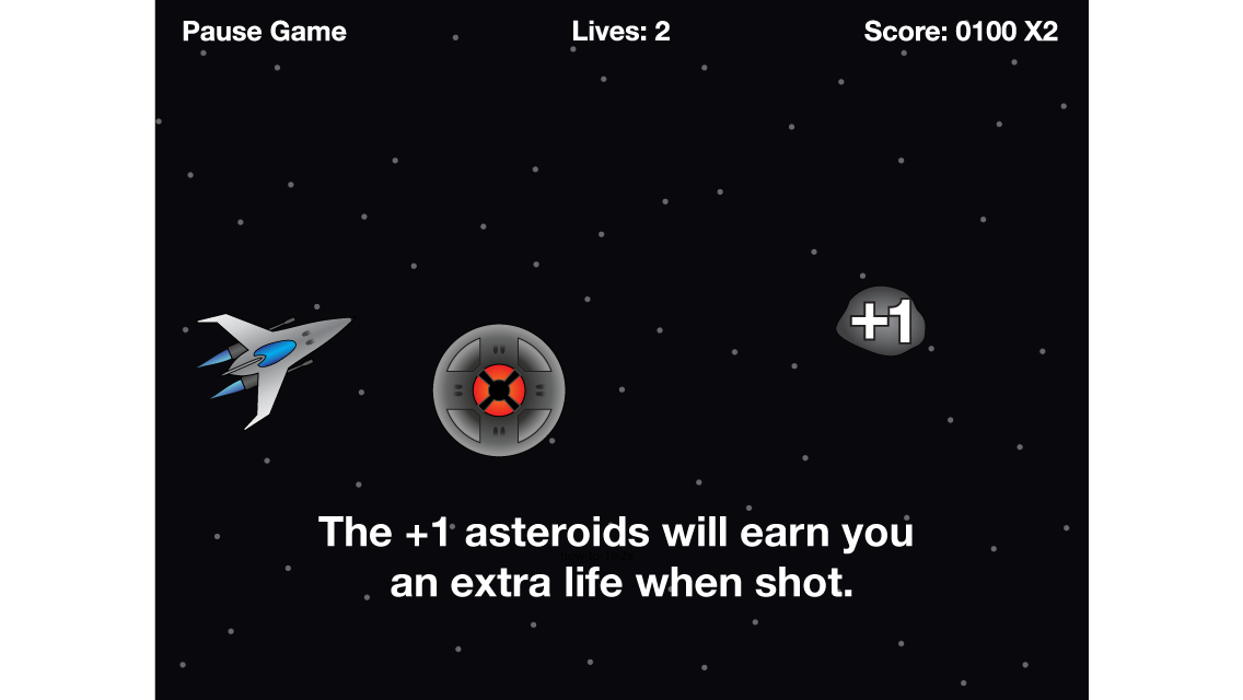 Flying saucers are trying to invade. Tap the screen to shoot a laser ball and blast them out of the sky! Earn 100 or more points per saucer destroyed. Hit 2500 points and you win! But be warned, you’ll lose a life for every saucer that gets past you. Lose 3 lives and it’s game over. Shooting asteroids will earn you bonuses too. The “+1” asteroids will earn you an extra life while “X2” will add 1 to your multiplier. Watch out for those missed saucers though! This will not only cost you a life, it will also reset your multiplier to 1.