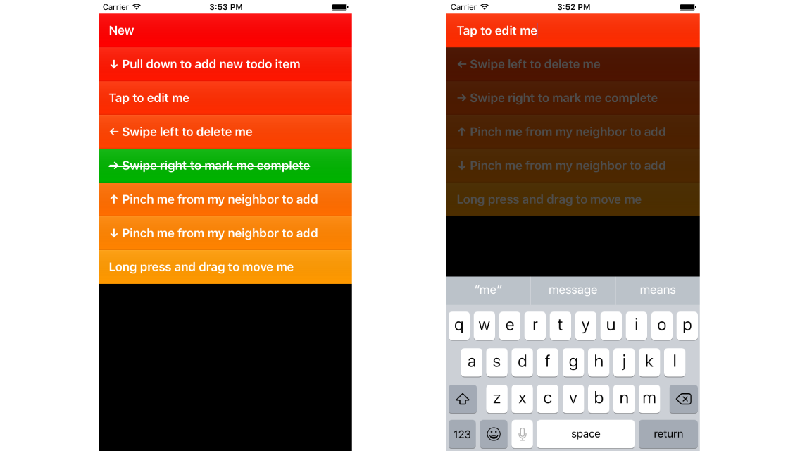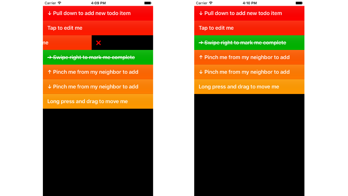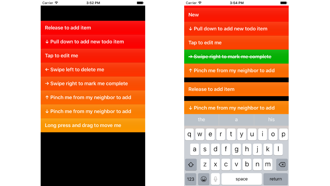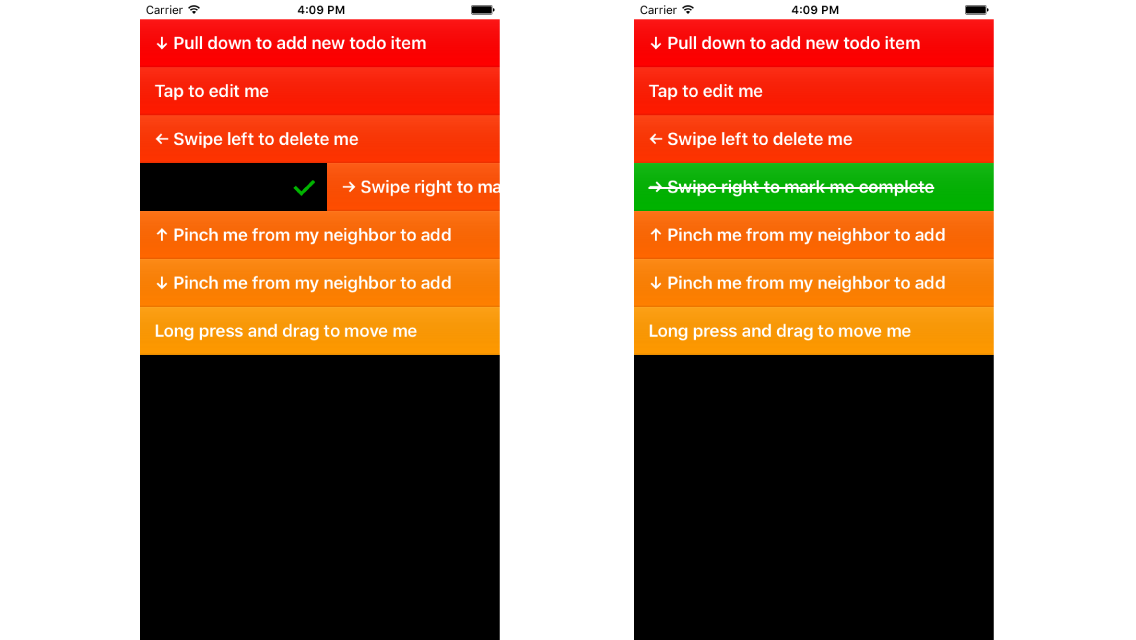 Swipe ToDo is a gesture based to-do list application. Some gestures include swipe right to mark item completed, swipe left to delete, tap to edit, long hold to move in order, etc. The app is being built in Swift, and will be available shortly.